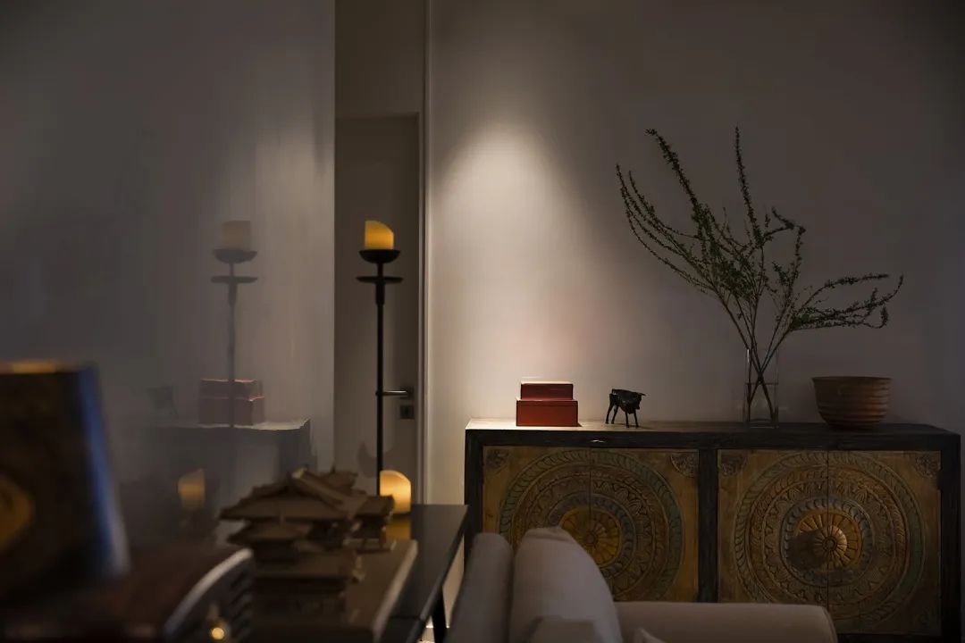 ▲在客厅一侧的过道摆了一个异域风格的小斗柜,摆上摆饰品与花瓶装饰,也为这个极简的空间增添了几分独特的设计氛围感。